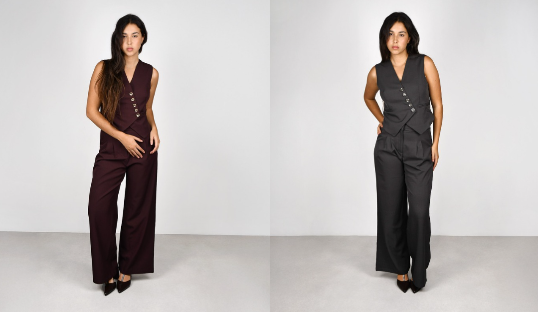 Una apuesta elegante y poderosa. Nuestro conjunto de pantalón de pinzas y chaleco con botones plateados redefine el clásico traje femenino con un aire contemporáneo y sofisticado. Disponible en gris y burdeos, es ideal tanto para el día a día en la ciudad como para un look de noche con carácter.